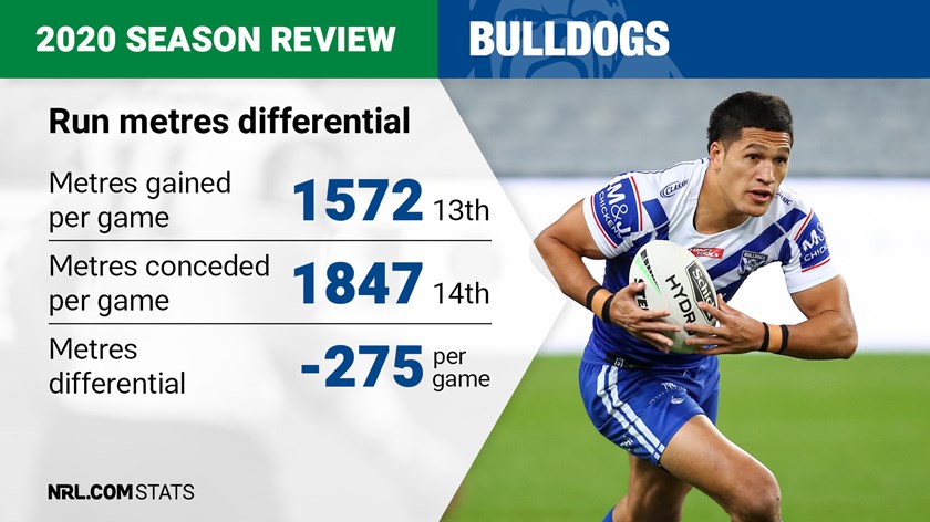 The Dogs gained the 13th most metres per game with 1572 and conceded more per match than any side bar the Broncos (dead equal with the Dragons) at 1847 per game for a differential of -275 metres per week. It's very hard to win games when you're getting outrun by that far.