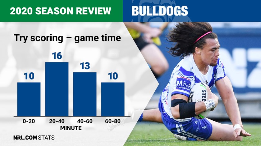The 20 minutes after half time was the Dogs' best period defensively with 20 tries for the season coming in that period, although the gap between their best and worst defensive quarters was not massive.