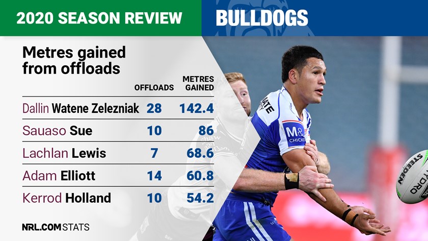 Offloads weren't a big part of the Canterbury playbook in season 2020, with Watene-Zelezniak's 28 for the season the most for the club and 11th most in the NRL.
