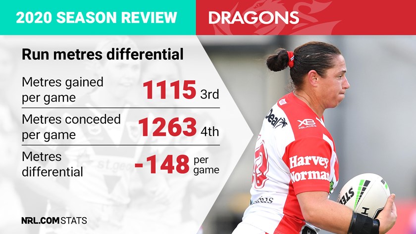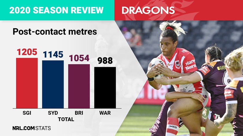 The Dragons' best efforts in the NRLW came through their post-contact yardage with their 1205-metre total outranking grand final teams Brisbane and the Roosters.