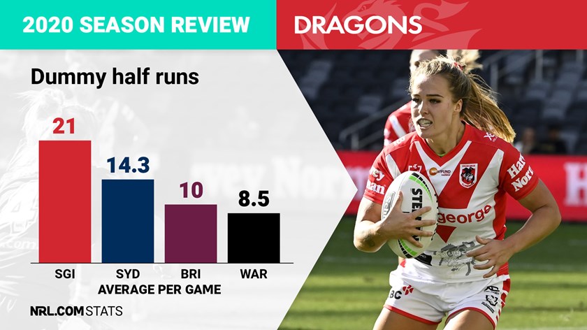 One area the Dragons excelled in this year was dummy-half runs with the likes of Isabelle Kelly, Jessica Sergis, Tiana Penitani and Sam Bremner very good.