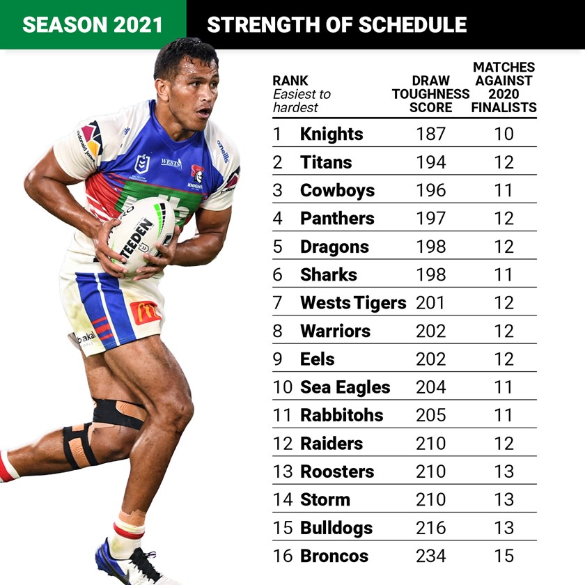 According to an analysis of the draw based solely on the strength of opponents, the Broncos face the trickiest fixture list of all with a pair of 2021 games against seven of the eight finalists from the 2020 season.