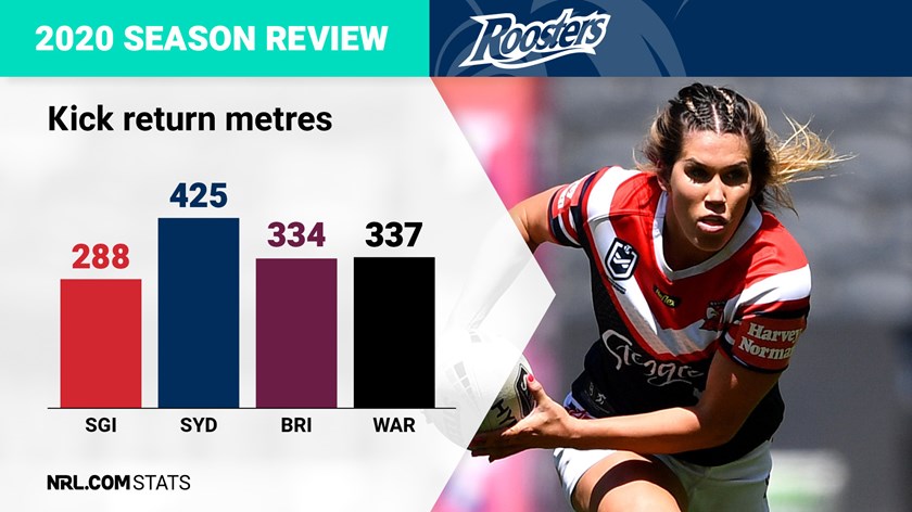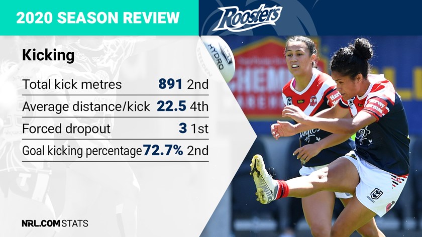 The Roosters relied on Zahara Temara in the halves with the playmaker taking 25 of the team's 36 kicks for a competition-high 624.9 kick metres.