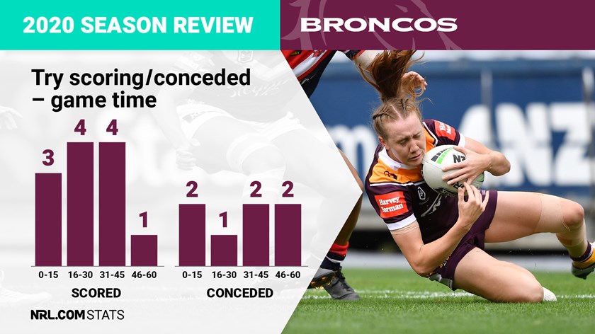 The Broncos scored seven tries across three first halves in 2020 with five tries coming in the second 30 minutes, while they conceded at most two in each 15-minute quarter.