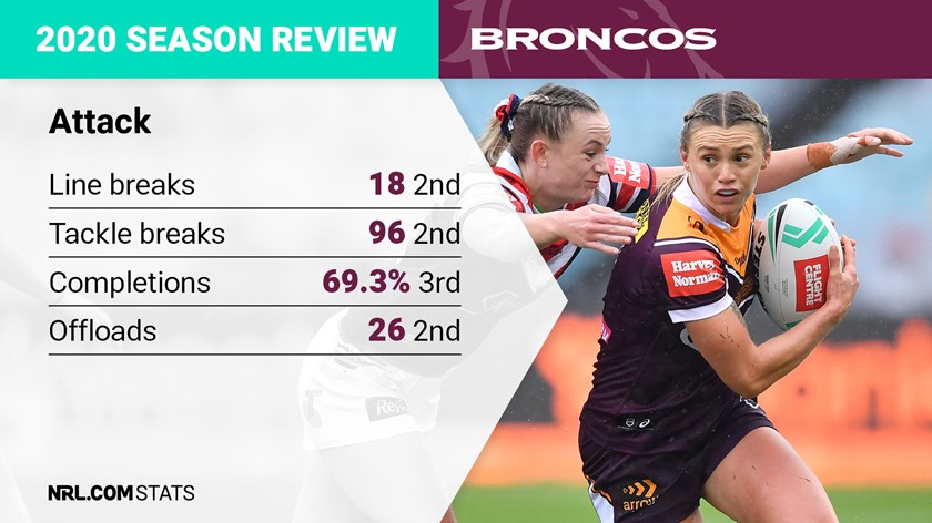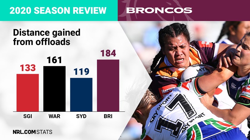 As offloads took another increase across the entire competition, the Broncos' key offload queens – Chelsea Lenarduzzi and Amber Hall – helped lead the way for a total 184 additional metres gained.