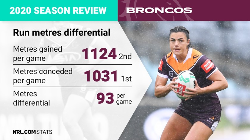 Brisbane were pipped by the Roosters for yardage gained this year but were effective where it counted most – reducing metres by the opposition.