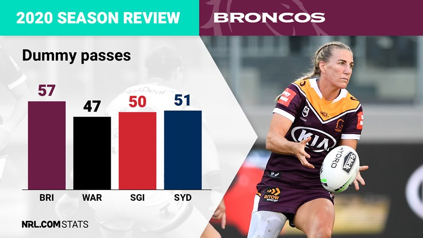 Ali Brigginshaw topped the competition with 22 dummy passes, double the NRLW's next best Maddie Studdon. Raecene McGregor (10) also finished in the top five.