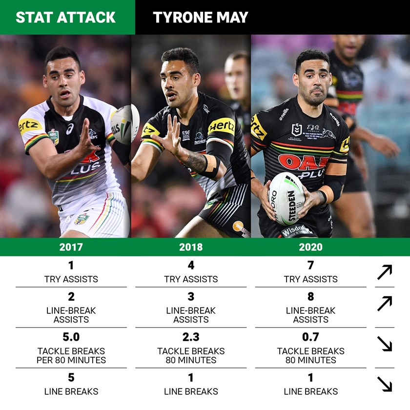 With a total of seven try assists and eight line-break assists for the season, May was easily the Panthers' third most prolific playmaker behind Jarome Luai (23 try assists, 20 line-break assists) and Nathan Cleary (17 try assists, 11 line-break assists) despite ranking 14th at the club for minutes played.