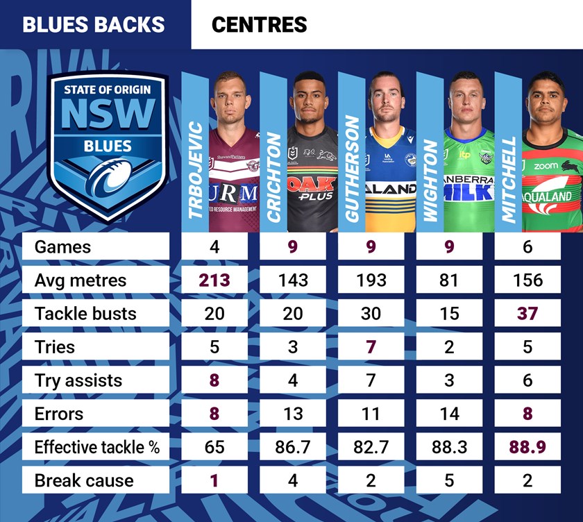 Overall it's tough to get a handle on what the numbers really mean given there are three fullbacks, one five-eighth and one centre in the mix but all five players are big, strong ball runners and physical defenders and all bar Crichton have Origin experience.