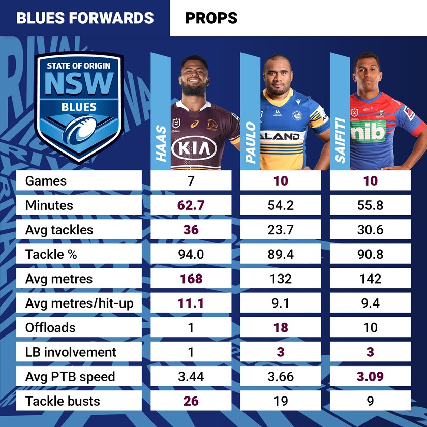 Incumbents Haas, Saifiti and Paulo have been in good form this year but the ease with which Queensland won the forward battle in last year's decider must be taken into account.
