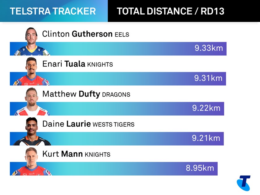 Newcastle centre Enari Tuala wasn't far behind (9.31km) followed by Dragons No.1 Matt Dufty (9.22km), Wests Tigers custodian Daine Laurie (9.21km) and Knights utility Kurt Mann (8.95km).