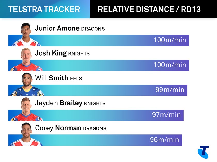 Rounding out the results, Newcastle prop Josh King made the most of a 36-minute stint off the bench - averaging 100 metres per minute. Dragons utility Talatau produced the same average metres per minute but only got 12 minutes of game-time.
