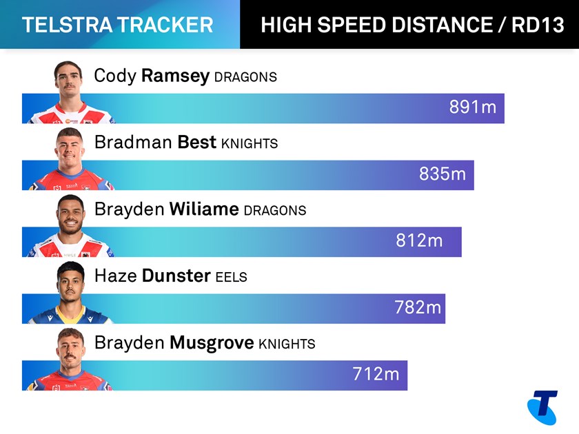 Ramsey chalked up the most high-speed metres (20km/h or more) with 891m, beating Newcastle centre Bradman Best (835) and his St George Illawarra teammate Brayden Wiliame (812).