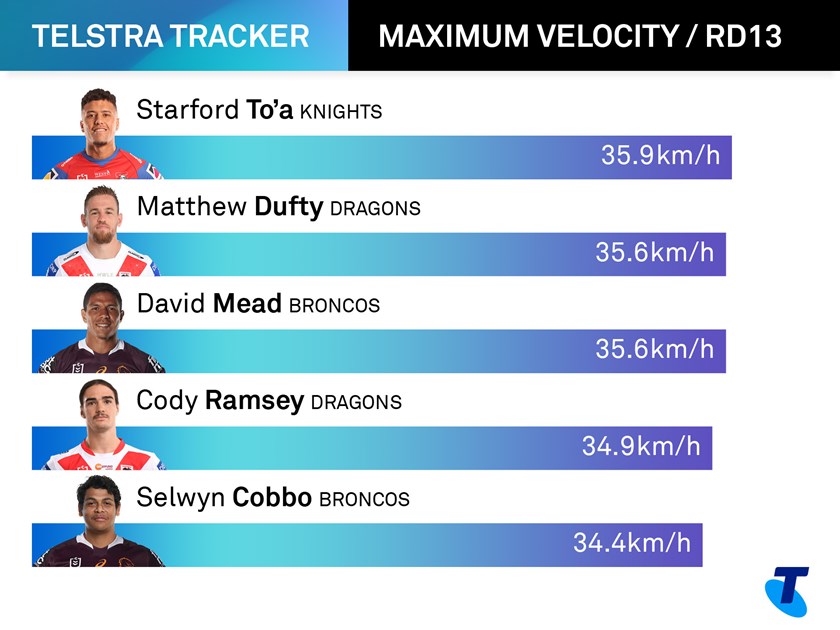 Broncos flyer David Mead (35.6km/h) equalled Dufty's top speed with Dragons winger Cody Ramsey (34.9km/h) and Brisbane debutant Selwyn Cobbo (34.4km/h) also posting impressive numbers.