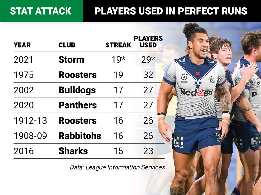 Whereas consistent team selections have long been the hallmark of any great side, Melbourne have used 29 players across their 19 victories - only the 1975 Roosters have used more among the premiership's most successful sides.