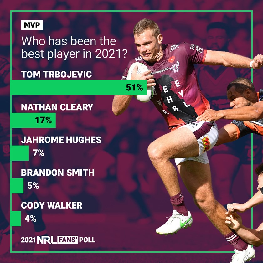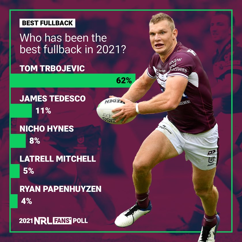 Just like on the field this season, Tom Trbojevic is in a league of his own after snaring more than half of the vote. Having only played seven matches last year, he wasn't even included in the poll.