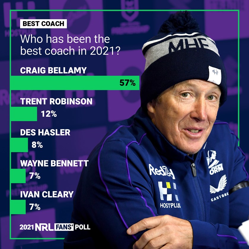 And the result for coach of the year was just as emphatic with Storm mentor Craig Bellamy (57%) the obvious choice having guided his champion team to 19 straight wins and counting.