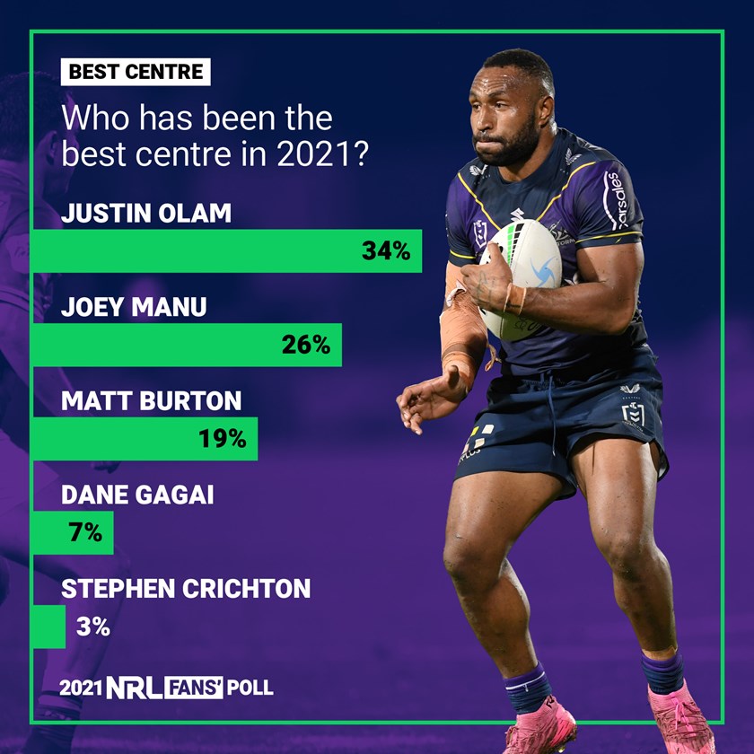 The continued rise of Justin Olam has resulted in the Storm powerhouse beating out Roosters gun Joey Manu for the top spot.