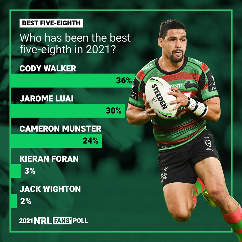 In a three-way race, Rabbitohs magician Cody Walker finished ahead of Penrith's Jarome Luai and Melbourne's Cameron Munster.