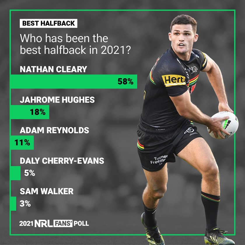It wasn't quite as big a margin as last year (78%), but Nathan Cleary again was the clear standout for best halfback honours.