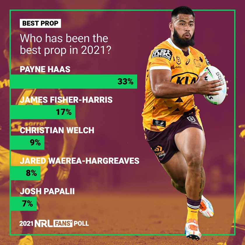 Haas finished second last year with 13% of the vote as Raiders prop Josh Papalii was chosen as the runaway winner (43%).