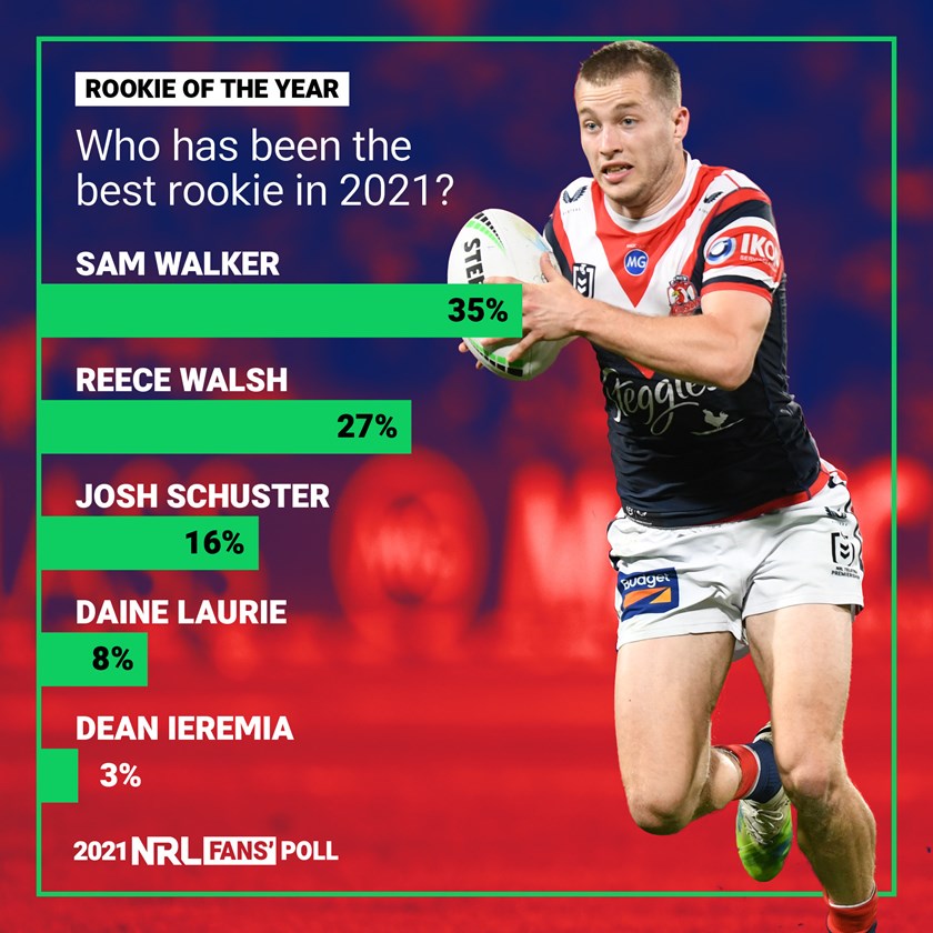 Fans saw this as a race in two with Roosters halfback Sam Walker edging out Warriors fullback Reece Walsh for first place.