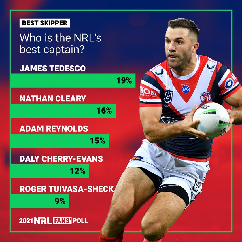 Roosters maestro James Tedesco has to settle for second place after coming out on top last year with 49% of the support.