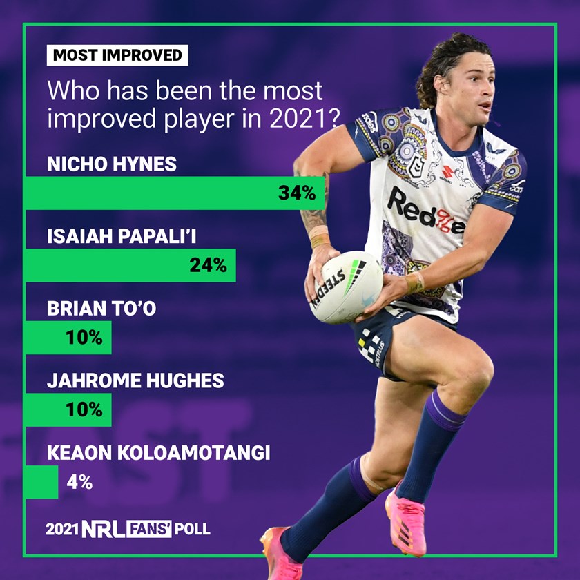 It's two years running that a Storm player has claimed this title with halfback Jahrome Hughes voted most improved in 2020.