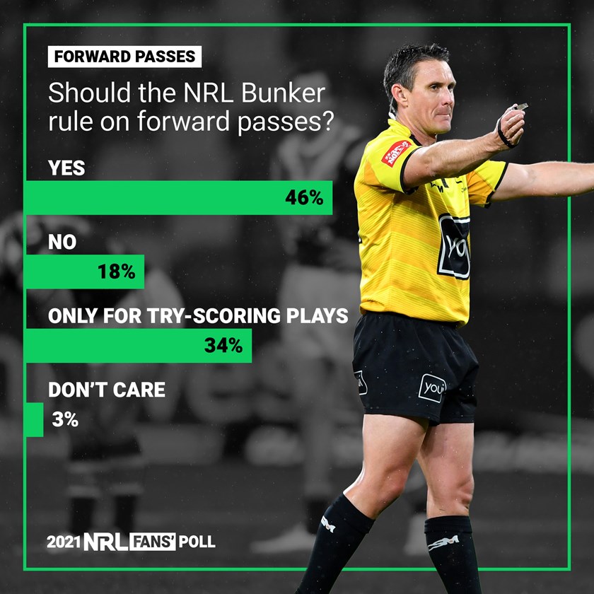 There remains an appetite for the Bunker to judge forward passes, but 34% of fans believe that should only occur on try-scoring plays.