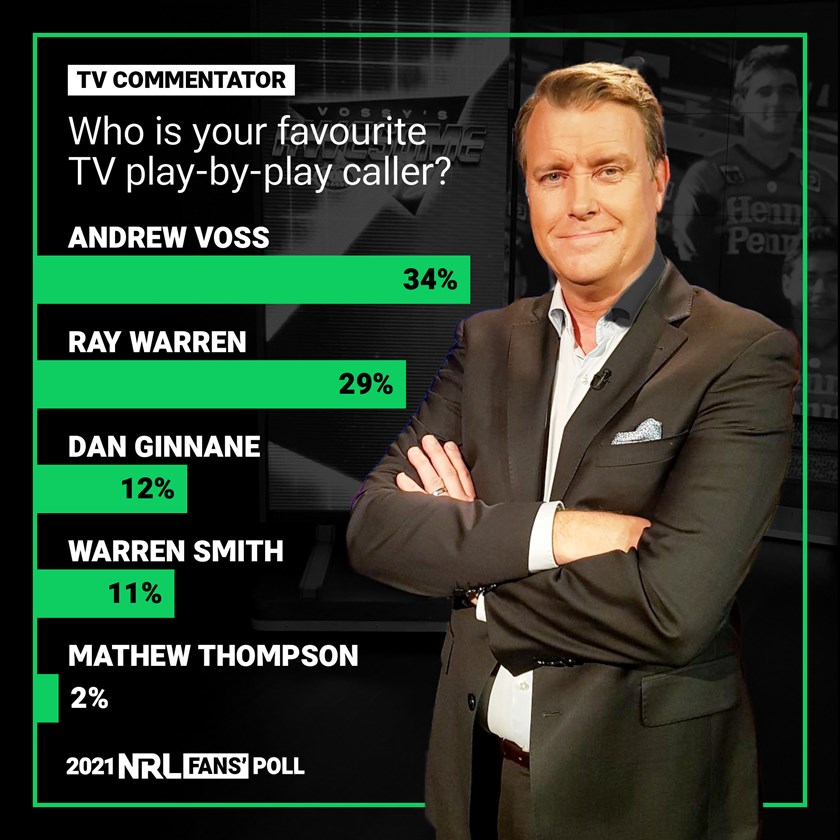 For the third year running, quick-witted Fox Sports commentator Andrew Voss has edged out Channel Nine doyen Ray Warren as the fans' favourite TV play-by-play caller.