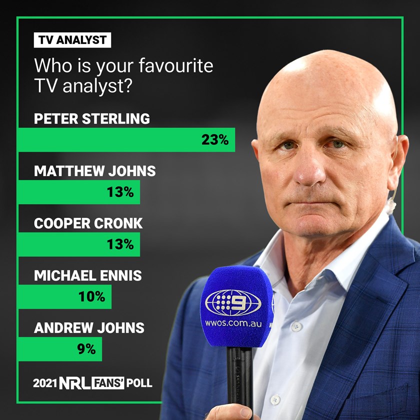 When it comes to analysis, fans most enjoy listening to Channel Nine's Peter Sterling break down the game with Fox Sports duo Matt Johns and Cooper Cronk's input also highly respected.