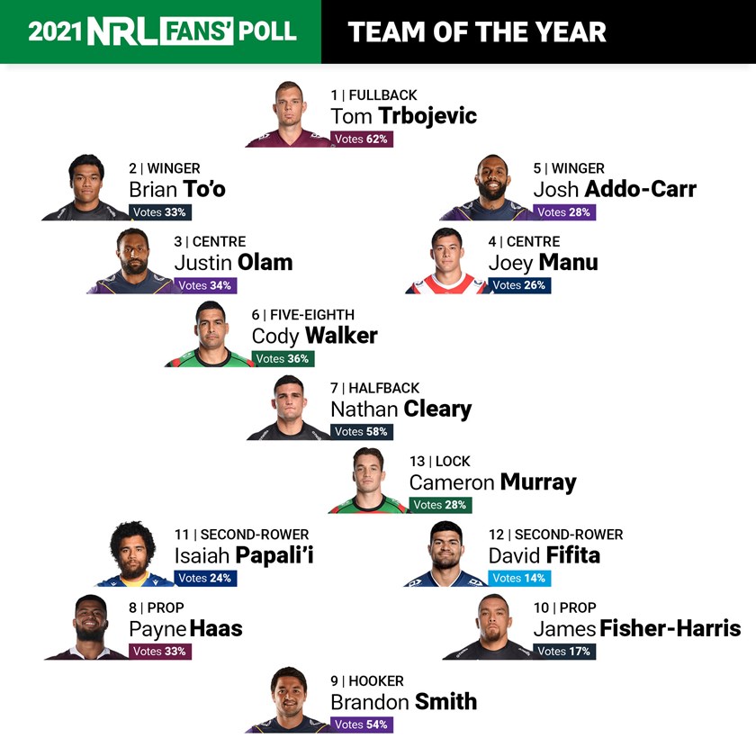 That follows the theme from last year with then-defending premiers the Roosters taking out the vote with 25%.