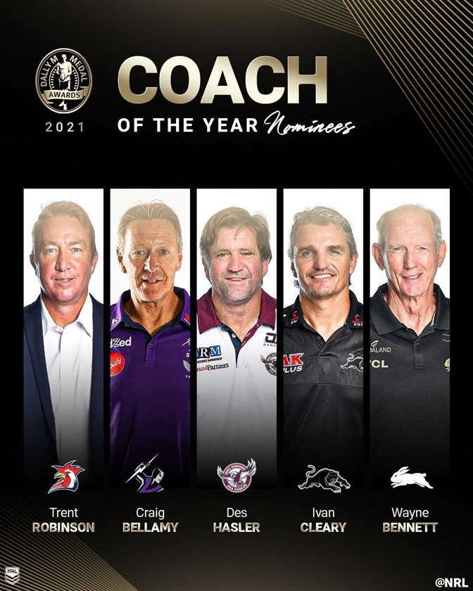 Meanwhile, the coaching candidates of the year were also unveiled with top four coaches Craig Bellamy, Ivan Cleary, Wayne Bennett and Des Hasler joining Roosters coach Trent Robinson in contention.