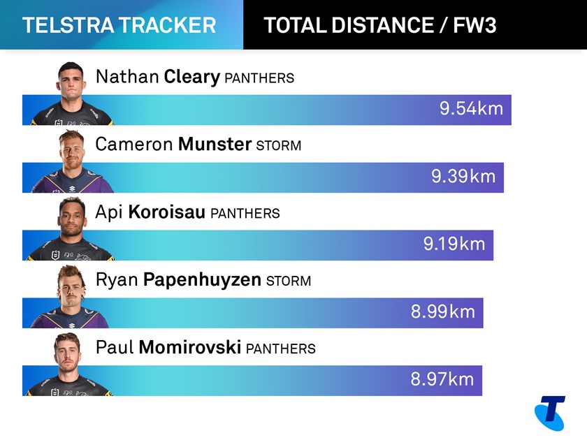 That was again the case in the preliminary finals as Cleary (9.54km) comfortably finished ahead of Storm five-eighth Cameron Munster (9.39km) and Penrith hooker Api Koroisau (9.19km).