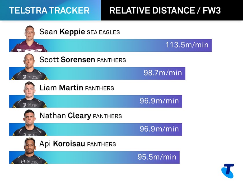 Sea Eagles prop Sean Keppie topped the relative distance leaderboard in unfortunate circumstances, averaging 113.5 metres per minute for the six minutes he played before leaving the field for a HIA which eventually ruled him out of the match.