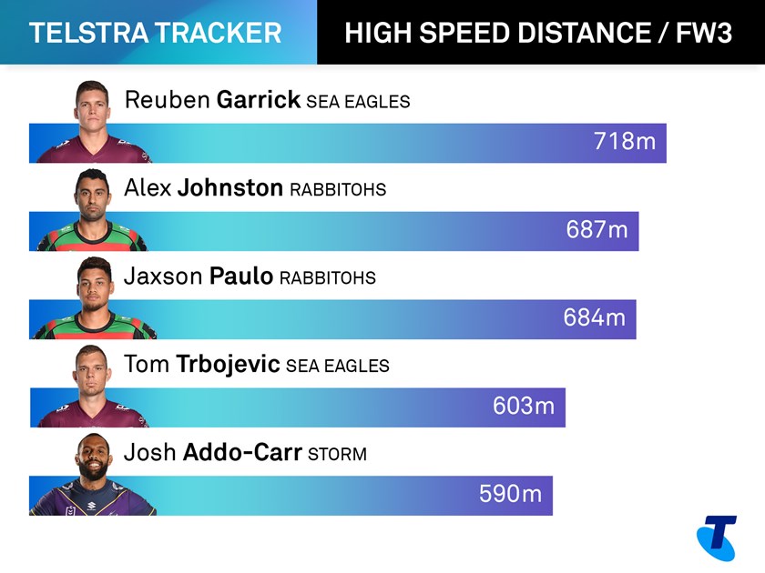 Manly flanker Reuben Garrick notched the most high-speed metres (20km/h or more) with 718hsm followed by South Sydney counterparts Alex Johnston (687hsm) and 21-year-old Paulo (684hsm).