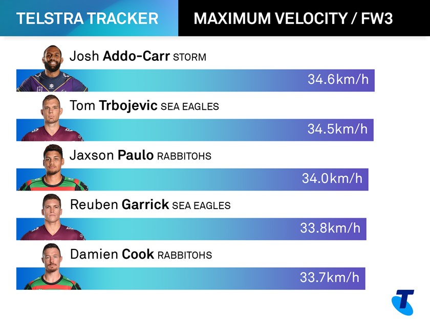 Elsewhere, Melbourne winger Josh Addo-Carr topped the speed category in his final match for the club, reaching a high of 34.6km/h.