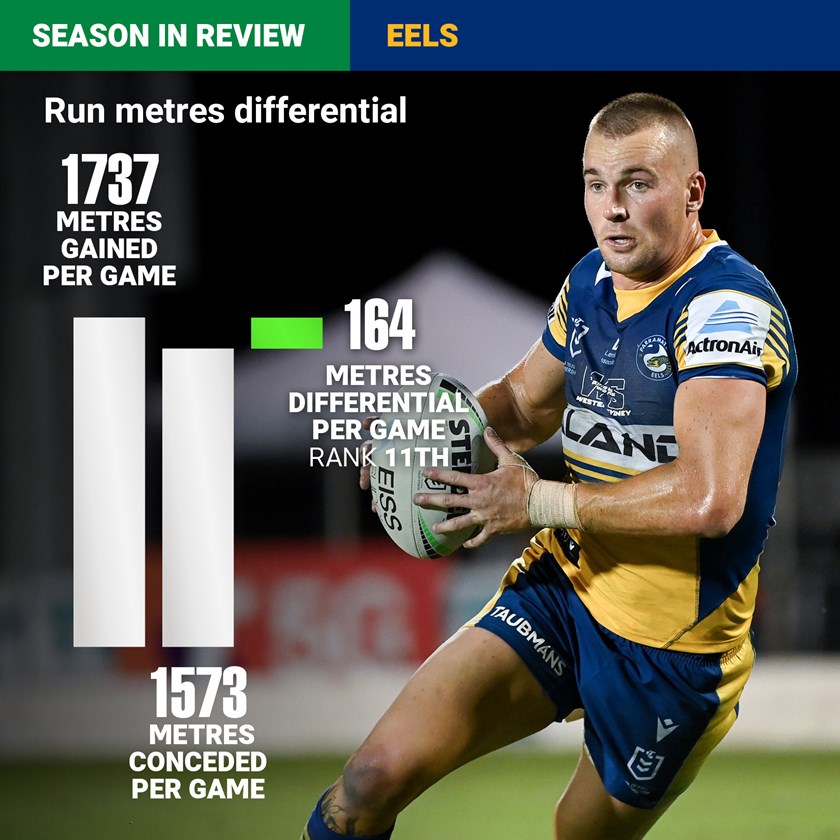 Only the Panthers and Rabbitohs earned more run metres than Parramatta this season, with skipper Clint Gutherson (170 metres per game), Papali'i (150m per game), winger Blake Ferguson (146m per game) and prop Reagan Campbell-Gillard (142m per game) their chief contributors.
