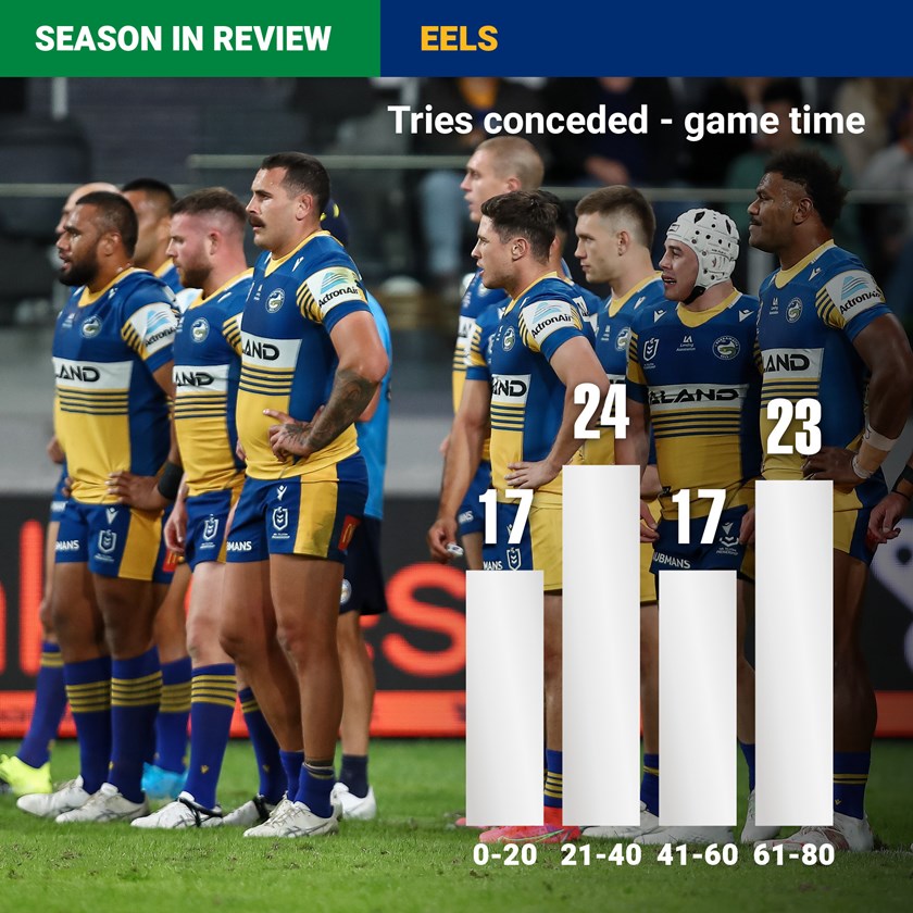 The Eels had the NRL's fourth-best defensive record in 2021 and they were especially miserly at the start of matches and immediately after half-time. Their defensive resolve faded a little as each half wore on but with their strong starts were enough to ensure they stayed on top in most matches.