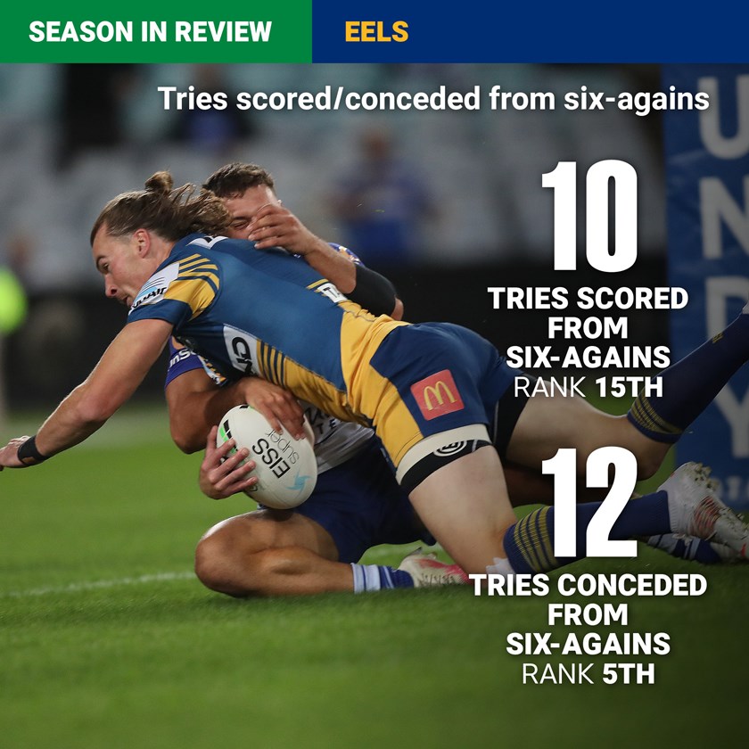 A potential area of improvement here, with the Eels ranking second-last in the league ahead of only Brisbane (9) in this category. Wooden-spooners Canterbury had 13, while top teams Melbourne and Manly had 22 apiece.