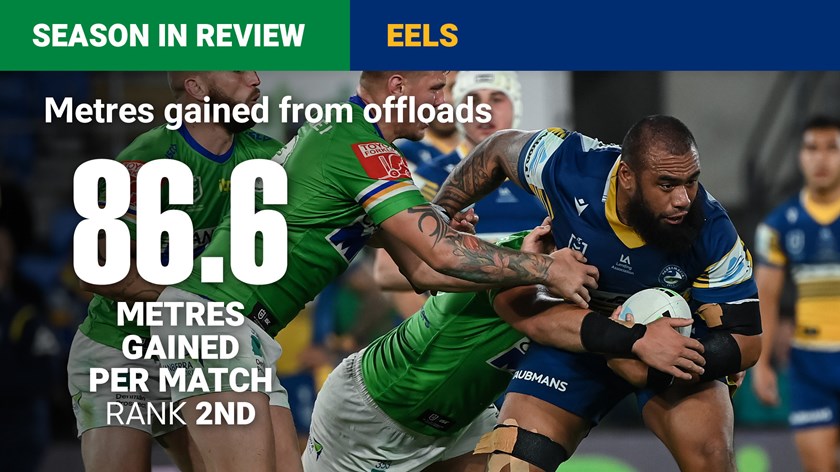Parramatta were the NRL's offload kings this year – with 302, well ahead of the second-placed Wests Tigers (290) and third-placed Broncos (275). But the Eels ranked second in terms of metres made from offloads with minor premiers Melbourne topping that tally with 97.4 per game.