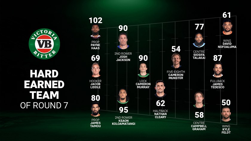 It was Payne Haas who topped the charts in Round 7, powering through a shoulder injury in his first game back from suspension with his 102 points bolstered by 18 runs of eight-plus metres, along with 31 tackles and zero errors.