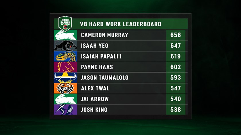 Overall, Cameron Murray (658 points) remains on top of the VB Hard Earned Index leaderboard with the Rabbitohs skipper still narrowly leading from Panthers skipper Isaah Yeo (647).