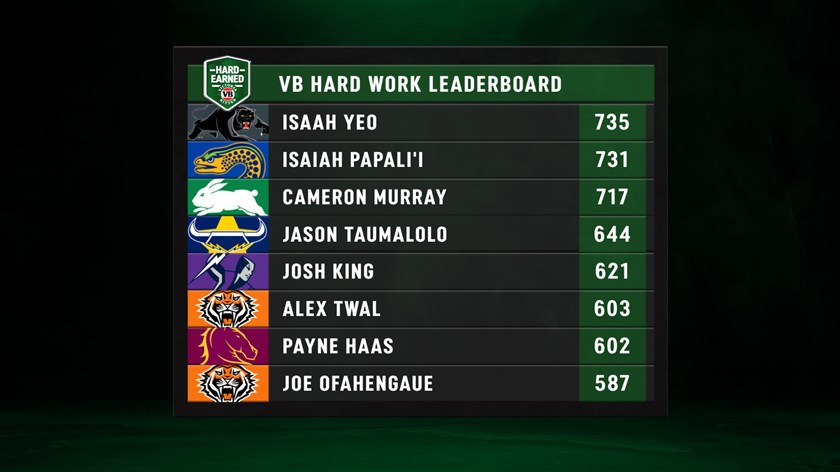 Papali'i's complete performance saw him pull within a whisker of Yeo on top of the Hard Earned Index leaderboard, with the Panthers skipper (735 points) now holding just a four-point lead from his Eels counterpart (731). Rabbitohs captain Cameron Murray isn't far behind that pair (717 points), with that trio kicking well clear of Jason Taumalolo (644) and Josh King (621), who head up the chasing pack.