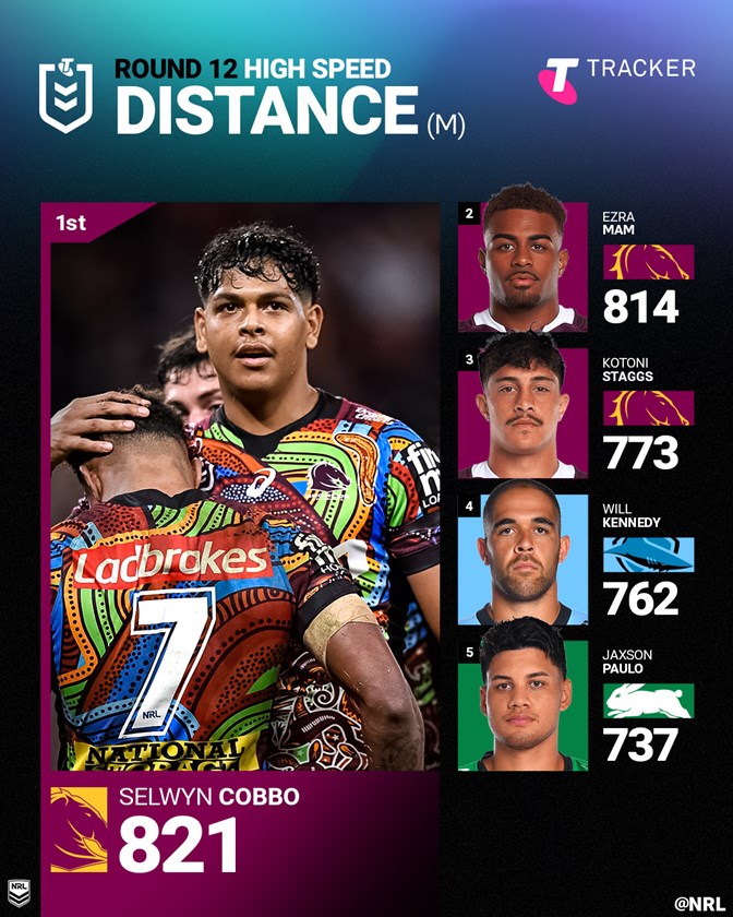 Brisbane's intensity to fight back against the Titans showed up in the number of players that starred in the high speed distance. Cobbo's 821 metres was narrowly ahead of halfback Ezra Mam (814 metres) while Kotoni Staggs made it a Broncos trifecta as he came in third with 773 metres.