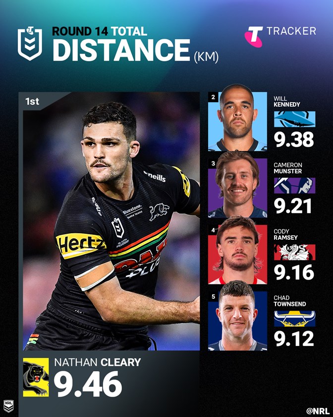 Cleary finished top of the charts in terms of total distance covered throughout Round 14, covering a total 9465 metres, while doing it a relative distance rate of 103.8 metres per minute (which trailed only Roosters bench forward Terrell May).