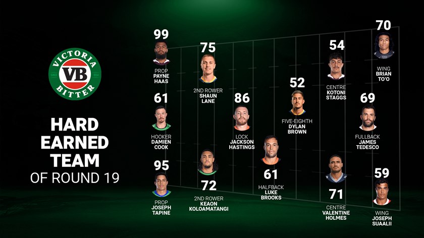Half-turned-lock Jackson Hastings is the only player in the round 19 Index Team of the Week who also made it last week, registering an impressive 19 line engagements to go with 31 tackles.