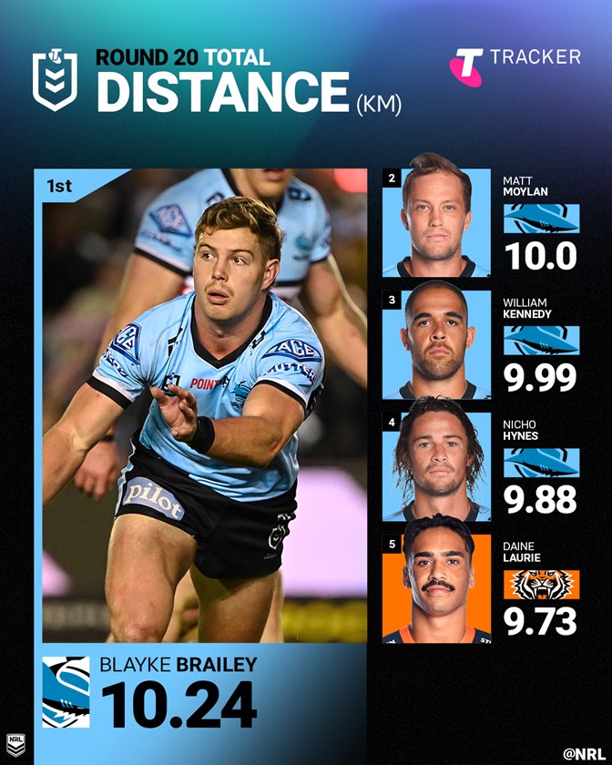 The extended duration of that game saw Sharks and Rabbitohs players dominate the total distance category for last weekend, with seven of the top 10 coming from those clubs.