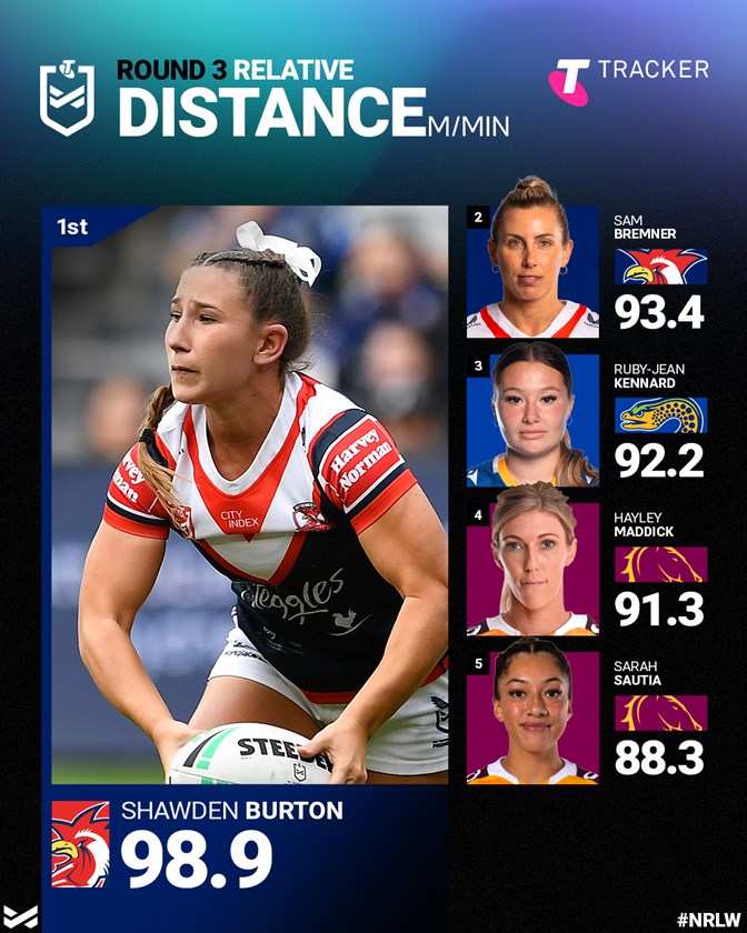 In Round 3 of the NRLW, Burton’s busy 28-minute stint in her side’s win over the Dragons saw her achieve this season’s highest relative distance of the year (98.9 metres/minute).