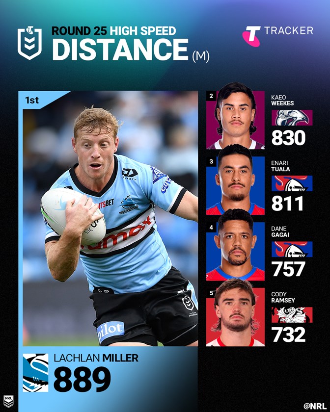 Sharks fullback Lachlan Miller led the way on the Telstra Tracker with efforts at high speed last weekend, while Roosters interchange hooker Shawden Burton achieved the most metres per minute of any player in the NRLW this season.